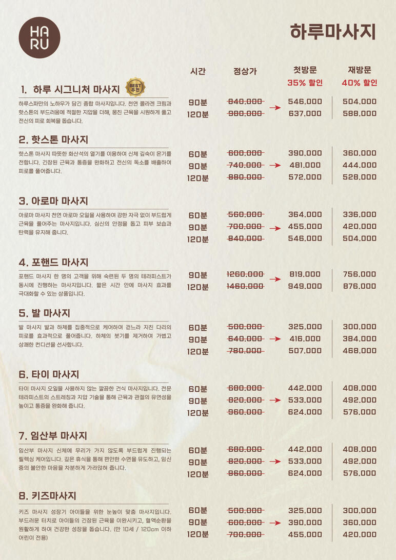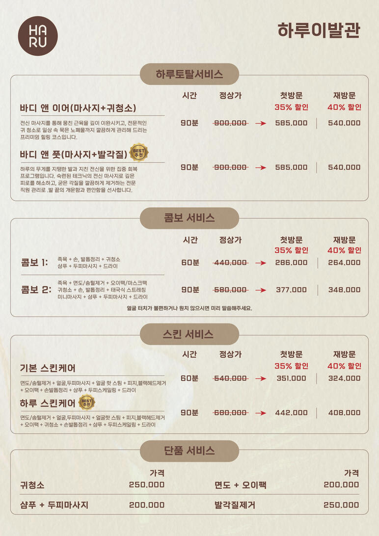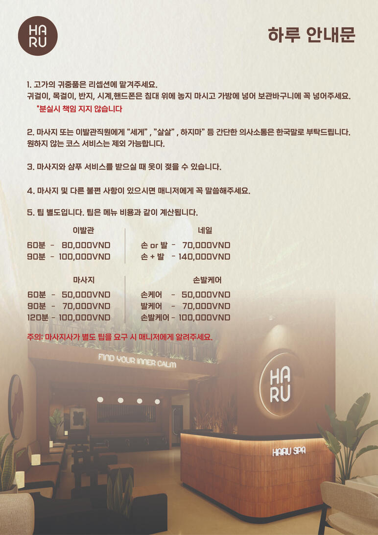 * 소개 하루스파 이발관앤네일은 5층건물로 26년도 신규 오픈한 프리미엄 멀티샵입니다. 다낭 한시장 앞에 위치하며 마사지,이발관,네일을 한 공간에서 경험할 수 있습니다.픽업드랍 및 예약 관련은 아래의 카카오톡 예약채널에서 직접 상담 도와드리겠습니다.